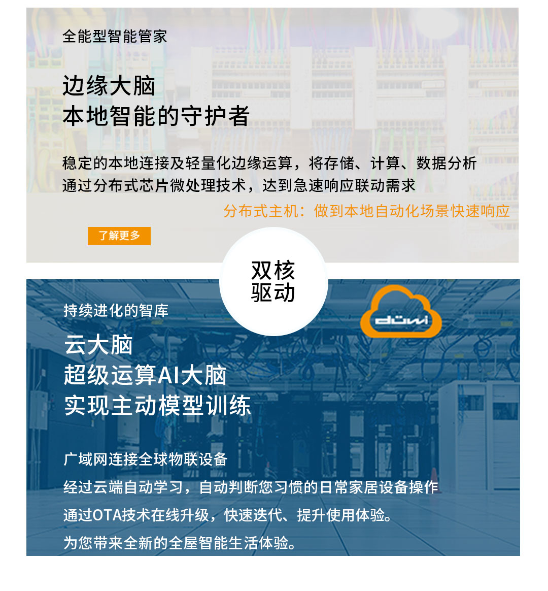 專注智能家居,一房一主機/網關,同個主機下的系統智能化以邊緣主機 為業務核心,從產品側區分主機的掛載能力,以適用不同住宅類型/面積。 連接穩定、持續更新、操作簡單, DUWI全屋智能系統帶來更好體驗!